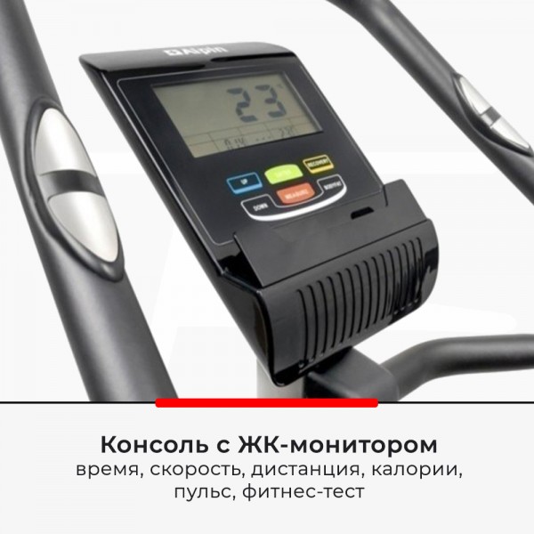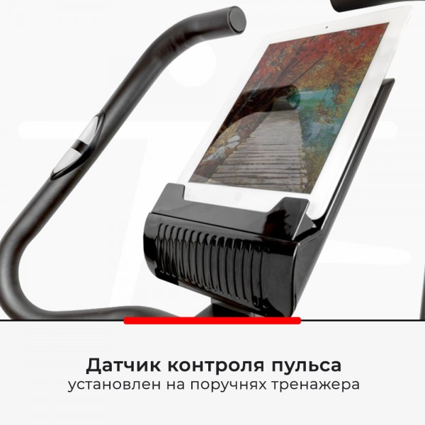Модель оснащена маховиком 9 кг, 3х-компонентым педальным узлом и прочной рамой. Задать нужную нагрузку можно вручную (8 положений). За счет регулировки положения седла в 2х плоскостях и круговому движению руля (включая положение "трасса") спортсмен любой комплекции сможет занять комфортную позицию. Есть датчики для проверки пульса.