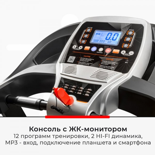 Память тренажера включает 12 режимов, можно подключить приложение G-fit (бесплатное). Встроены два динамика, есть подключение MP3. На контрастном жк-дисплее можно проверить: