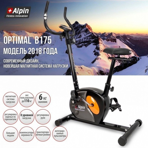 ALPIN Optimal B-175 – домашний велотренажер с магнитным типом нагрузки и стильным современным дизайном. Ограничение веса 110 кг, роста до 175 см.