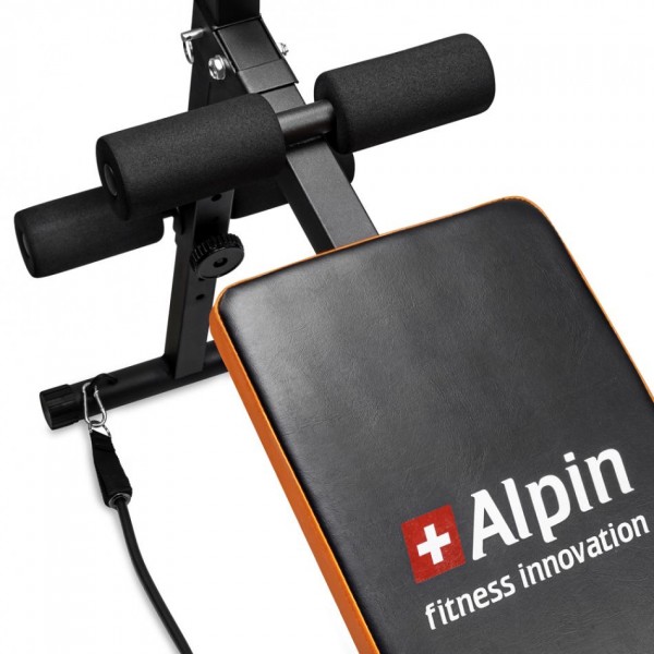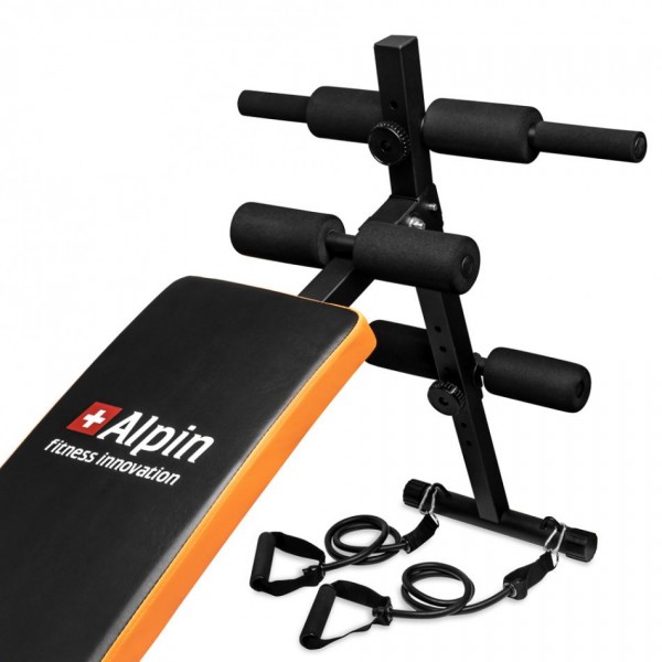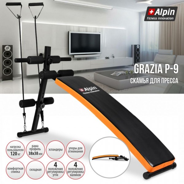 Alpin Grazia P-9 – комфортная скамья для тренировки пресса, которая рассчитана на вес до 120 кг и комплектуется эспандерами. Модель имеет складную конструкцию.