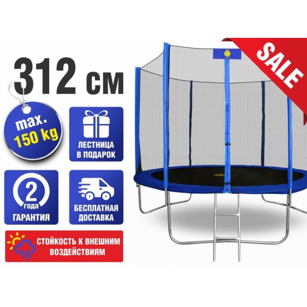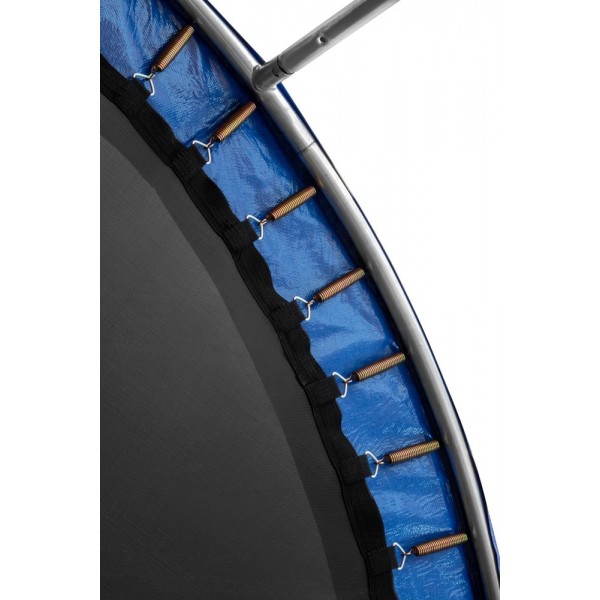 Конструкция основана на прочной раме и пружинах с гальванизированным покрытием. Предусмотрена защита входа с удобной застежкой-молнией и внешней фиксацией. Мат, прыжковое полотно и чехлы изготовлены из материала, устойчивого к воздействию яркого солнечного свету. Прыжковое полотно выполнено из материала высшего класса Перматрон. Батут поставляется с лестницей.