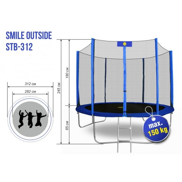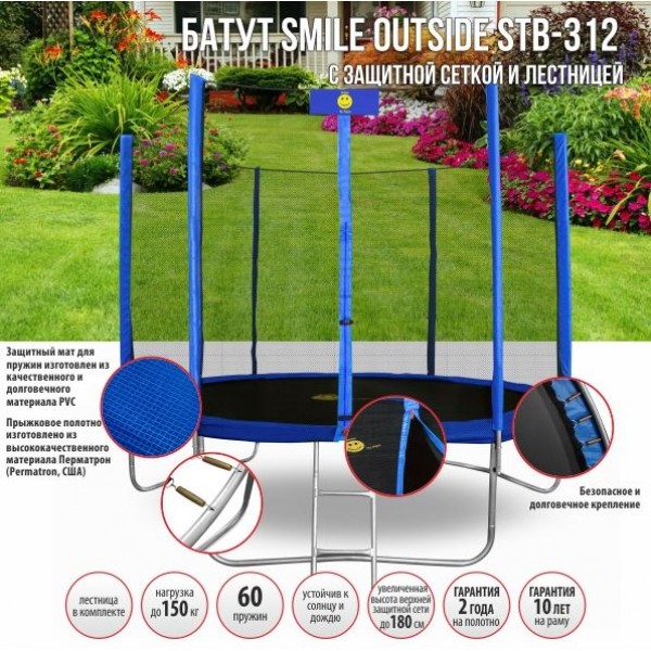 Батуты Smile изготовлены по современной технологии и будут надежно служить на Вашем участке для развлечения всей семьи. Нагрузка до 120 кг.