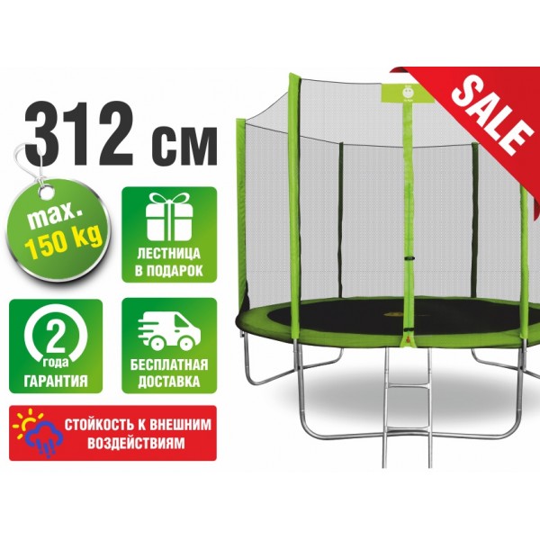 Конструкция основана на прочной раме и пружинах с гальванизированным покрытием. Предусмотрена защита входа с удобной застежкой-молнией и внешней фиксацией. Мат, прыжковое полотно и чехлы изготовлены из материала, устойчивого к воздействию яркого солнечного свету. Прыжковое полотно выполнено из материала высшего класса Перматрон. Батут поставляется с лестницей.