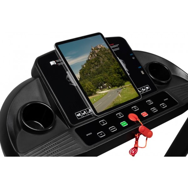 Двигатель на 2 л.с. разгоняет полотно шириной 42 см до скорости 14 км/ч. Дека толщиной 16 мм выполнена с парафиновой обработкой. Конструкция включает 2 эластомера для снижения ударной нагрузки на суставы. Предусмотрена три уровня наклона и проверка пульса.