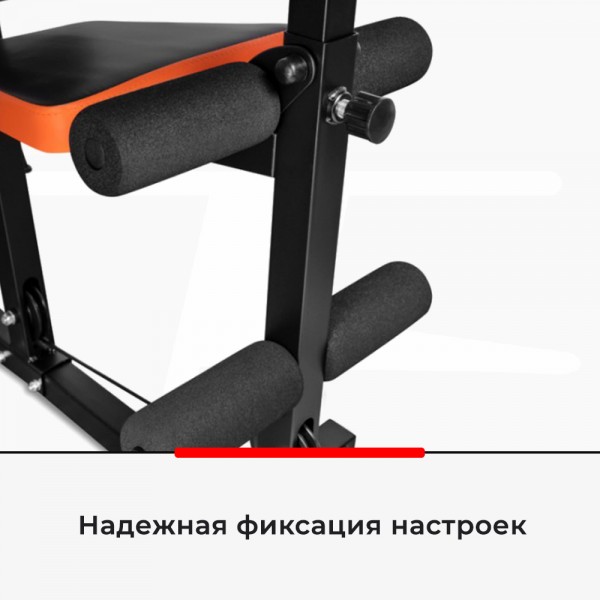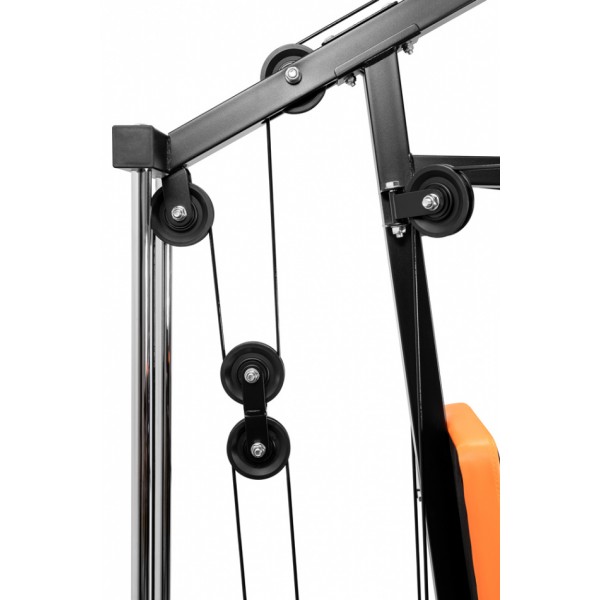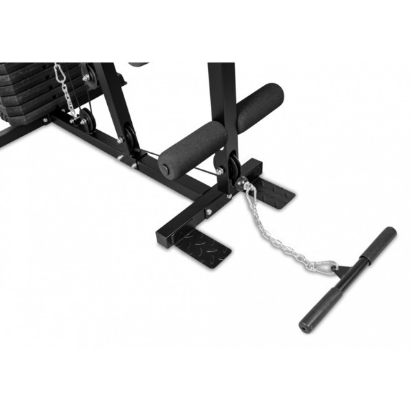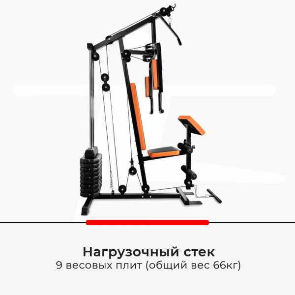 Комплекс позволяет выполнять оба вида тяги, различные жимы, упражнения для спины, ног и пресса. Стек нагрузки имеет защитный кожух и работает с малым шумом.