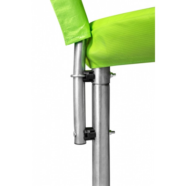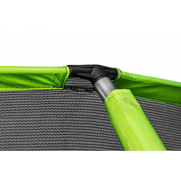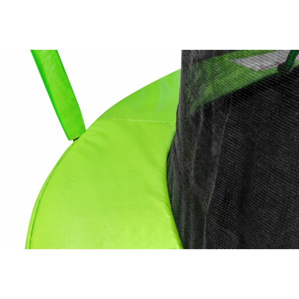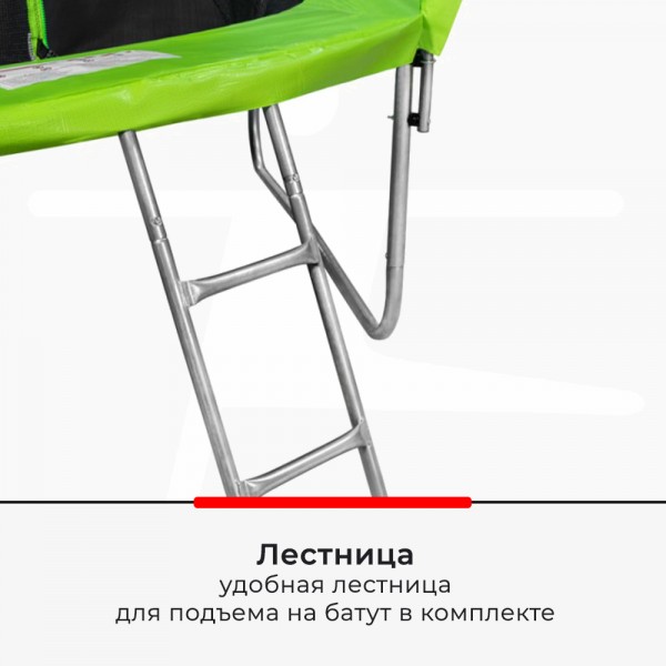 В основе батута - усвоершенствованный каркас с удлиненными стойками для сетки, что увеличивает сопротивляемость этих стоек на излом. Используемые пружины имеют специальное антикоррозийное покрытие и максимально надежное крепление. Полотно батута выполнено из особого материала Перматрон (США). Батут комплектуется лестницей.