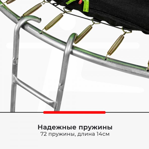 В основе батута - усвоершенствованный каркас с удлиненными стойками для сетки, что увеличивает сопротивляемость этих стоек на излом. Используемые пружины имеют специальное антикоррозийное покрытие и максимально надежное крепление. Полотно батута выполнено из особого материала Перматрон (США). Батут комплектуется лестницей.