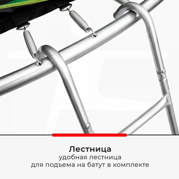Модель использует прочный каркас с удлиненными стойками для сетки, что повышает устойчивость батута и увеличивает сопротивляемость данных стоек на излом. Надежная фиксация к пружинам закрыта специальным кожухом, а само прыжковое полотно произведено из высококачественного американского материала Перматрон. Батут комплектуется лестницей.