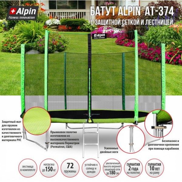 Батуты ALPIN имеют усовершенствованную конструкцию основы и повышенную надежность для эксплуатации на улице.