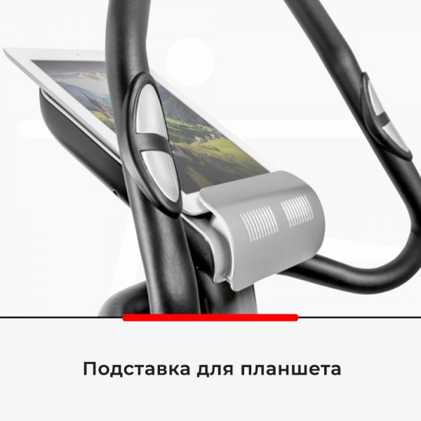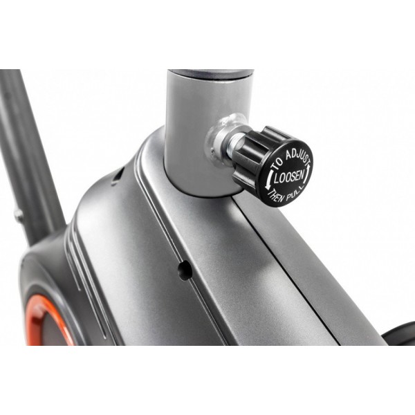 Конструкция использует сбалансированный маховик весом 6 кг, а также 3-компонентый педальный узел. Вручную можно подобрать нужный уровень сопротивления. Предусмотрена корректировка положения седла в двух плоскостях, а руль можно вращать по кругу. Есть проверка пульса сенсорами на поручнях.