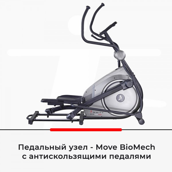 Модель предлагает улучшенную длину шага в 54 см. Тренажер базируется на надежной двусоставной раме и стальном треке, а оптимальное движение обеспечивают высококачественный привод PlastPRO, промышленные подшипники IDS Bearings и японские подшипники NSK, на которых функционирует основная ось модели. Педально-рычажной механизм Move BioMech использует подвижное крепление к приводу, а плавность траектории перемещения гарантируют шарнирные подшипники FishEYE. Для снижения нагрузки на суставы пользователя, движение выполняется на низкой высоте без резких колебаний. Расстояние между педалями (Q-фактор) позволяет обеспечить правильную биомеханику на высокой скорости.