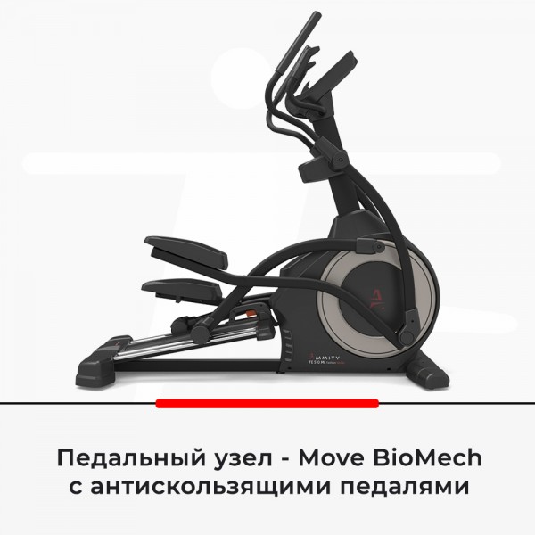 Надежность оборудования основана на цельной раме и алюминиевом треке, а оптимальное перемещение спортсмена обеспечивают современный привод PlastPRO и маховик на 28 кг (инерционный вес), промышленные подшипники. Педально-рычажной механизм Move BioMech зафиксирован на приводе подвижно, а для плавности траектории движения установлены шарнирные подшипники FishEYE. Чтобы минимизировать нагрузку на суставы, движение выполняется без резких переключений. Интервал между педалями (Q-фактор) в данной модели всего 2,7 см, поэтому правильная биомеханика доступна и на высокой скорости.