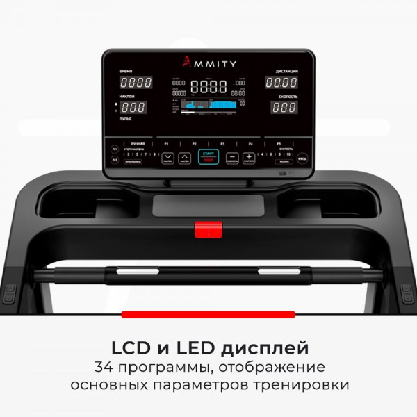 Все настройки и управление дорожкой выполнено на русском языке. Модель оснащена семидюймовым LCD дисплеем и LED экранами, на которых видны все необходимые параметры забега. Среди 34 программ есть 4 пользовательских, целевые и пульсозависимые режимы, а также фитнес-тест и BMI. Дорожка также оснащена: