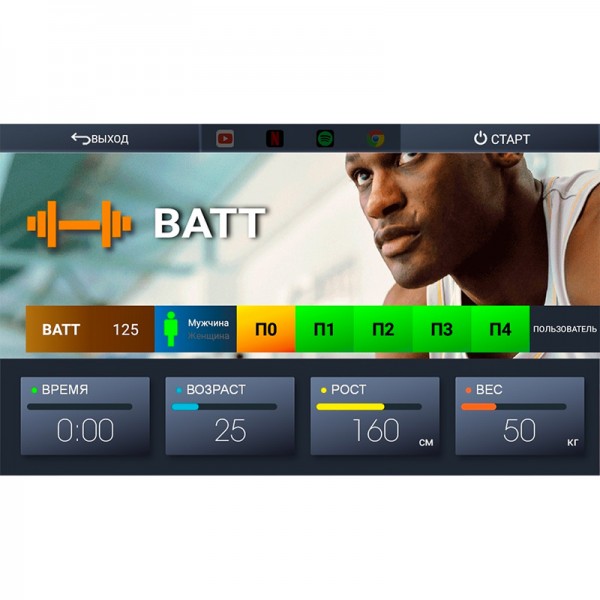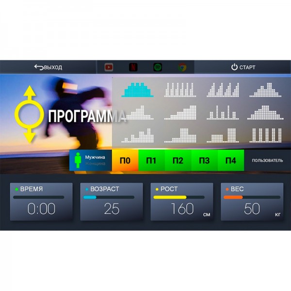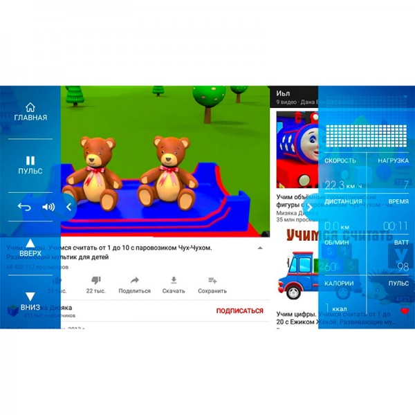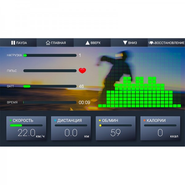 Сенсорный семидюймовый TFT дисплей предоставляет информацию о всех настройках и ходе тренировки (на русском). Консоль подключается к интернету, просматривать страницы в браузере, пользоваться сервисами YouTube, Spotify и соцсетями. Сделать тренировку интереснее поможет система виртуального ландшафта Kinomap. Среди встроенных программ: