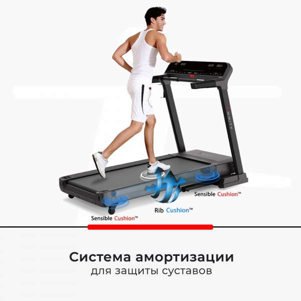 Двигатель на 3,25 л. с. разгоняет дорожку до 20 км/ч и предлагает выбрать 15 углов наклона для изменения интенсивности тренировки. Прочное большое полотно толщиной 1,6 мм оснащено зонированной амортизацией. За безопасность суставов во время движения отвечают эластомеры SensibleCushion, чью работу дополняют модули RibCushion.