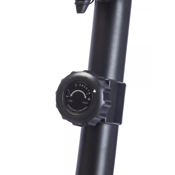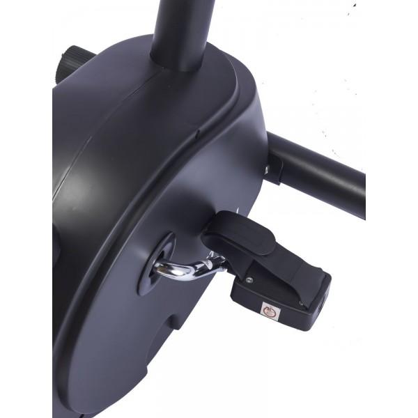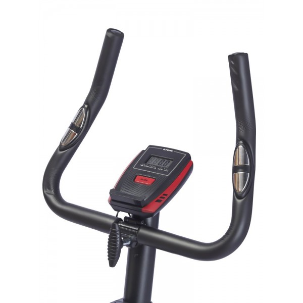 Конструкция основана на маховике весом 3 кг, поэтому общий вес тренажера также невелик. Поручни руля оборудованы датчиками проверки пульса. Положение седла по высоте можно подобрать вручную. Установлены ролики для перемещения.