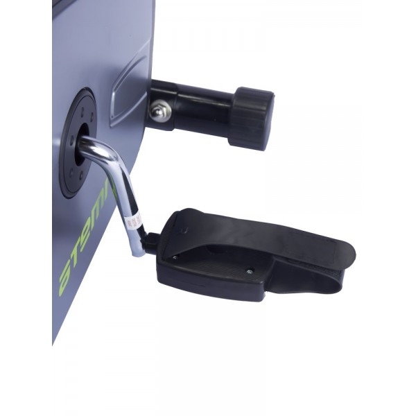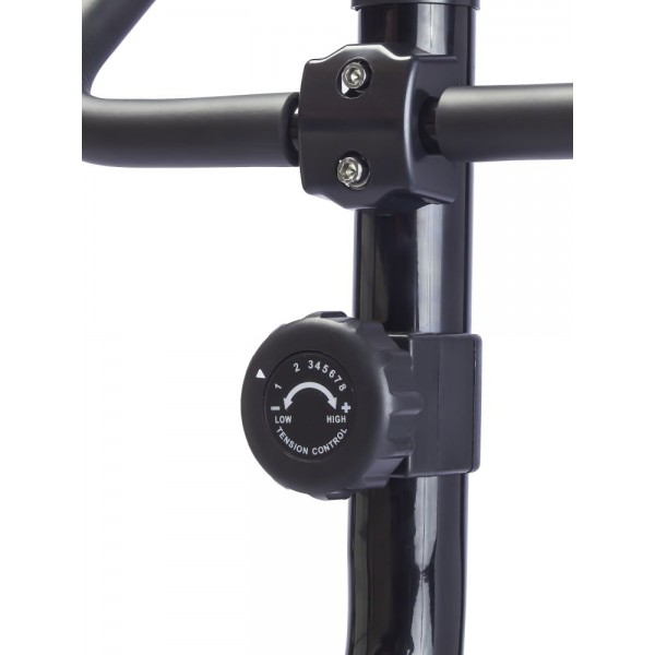 Модель работает с маховиком 5 кг и предлагает настройку высоты седла и комфортные педали. Поручни руля снабжены датчиками проверки частоты пульса. Встроены ролики для перемещения.