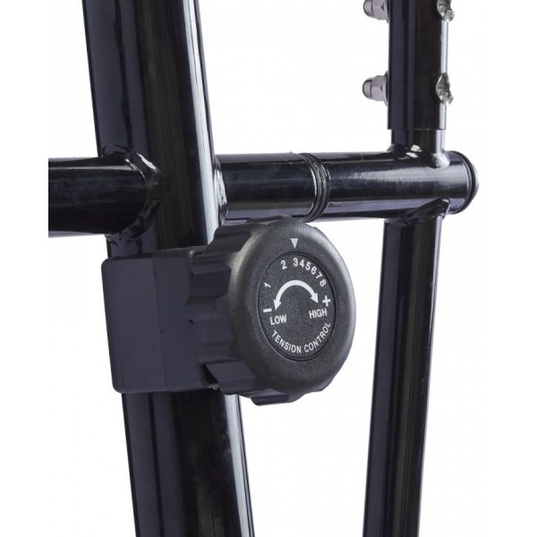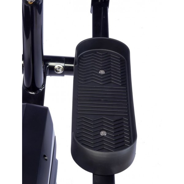 Модель имеет небольшую длину шага - 28 см, поэтому не рекомендуется высоким пользователям. Тренажер поддерживает 8 вариантов нагрузки и использует маховик весом 5 кг. Установлены сенсоры для проверки частоты пульса. Ролики помогут переместить тренажер по дому.