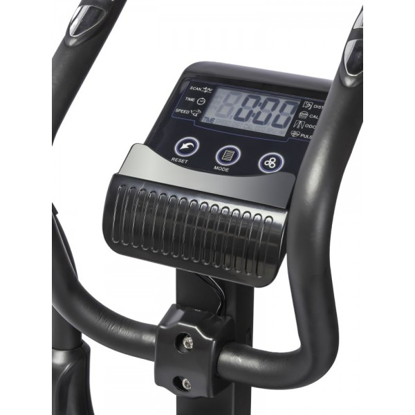 Тренажер предлагает длину шага 34 см, такое значение подойдет спортсмена среднего роста. Держать под контролем работу сердца помогут встроенные датчики на рукоятях. Нагрузка регулируется механически, есть 8 уровней. Встроенные ролики установлены для передвижения орбитрека по комнате.