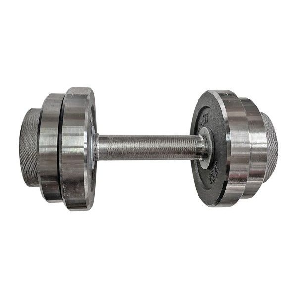 Гантель АтлантСпорт изготовлена из прочной стали 40XH. Рукоять имеет противосользящую насечку (диаметр 2,6 см, накатка 1х1 мм, межпосадочный интервал 13 см). В комплект входят две гайки по 0,5 кг и гриф весом 1 кг, а также диски: