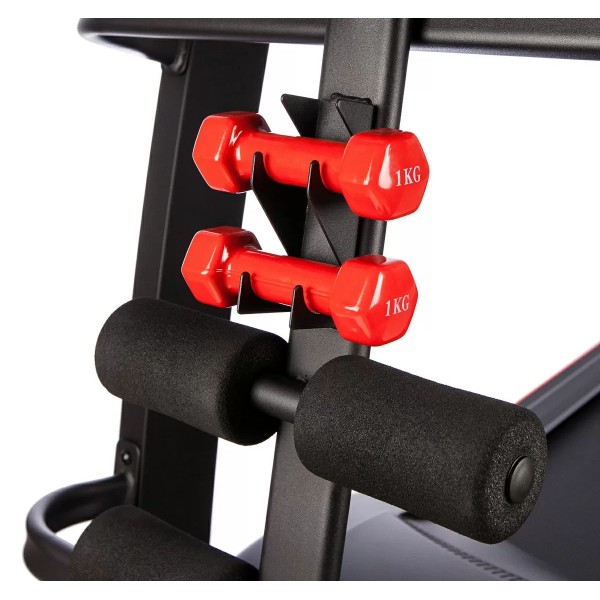 Тренажер оснащен роликами для перемещения и его легко сложить.