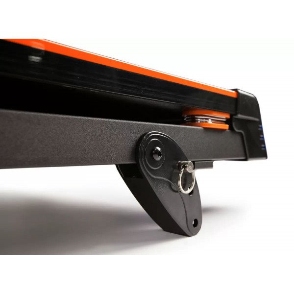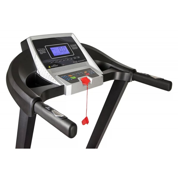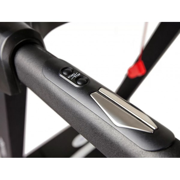 Мотор на 2 л.с. позволяет провести тренировку на скорости до 16,8 км/ч. Вручную можно поменять наклон полотна, что увеличит нагрузку на спортсмена. Скорость меняется на поручнях и на консоли (кнопки прямого выбора). Полотно оборудовано системой амортизации. Есть проверка пульса.