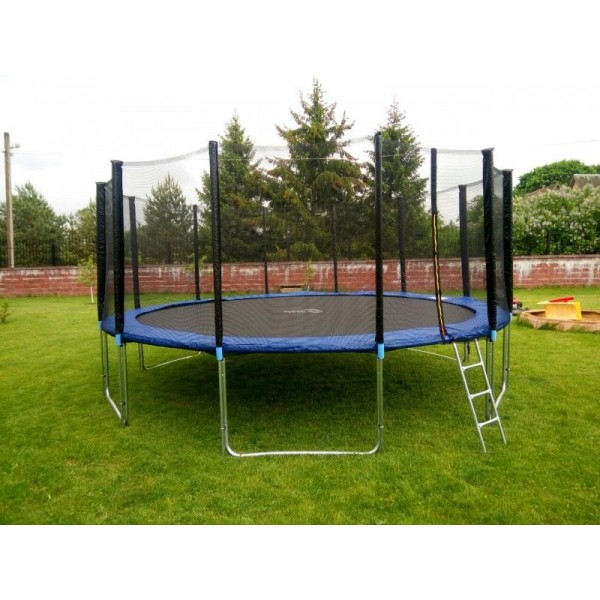 Длительный срок эксплуатации и безопасность обеспечивает использование металлического каркаса с двойной оцинковкой (внутри и снаружи) и усиленные опоры. Специальная форма пружин и их крепление на треугольных карабинах с восемью сверхпрочными швами обеспечивают надежность соединения с прыжковым полотном из Перматрона. Пружинный блок закрывается чехлом. Защитная сеть достаточно высока и эластична, вход в нее сделан на молнии с фиксаторами.