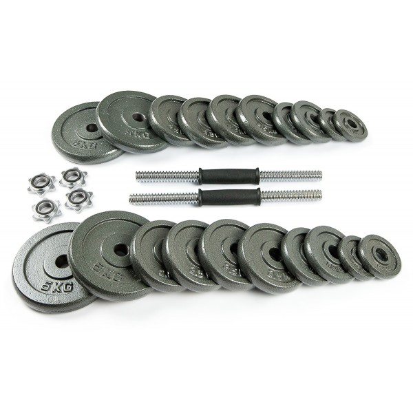 4 диска по 0,5 кг, 4 диска по 1,25 кг, 4 диска по 8,5 кг, 4 диска по 5 кг.