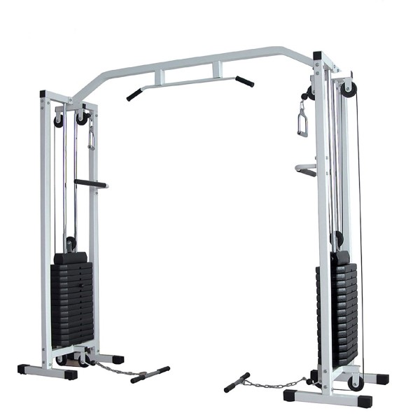 Две стойки тренажера оснащены весовыми стеками по 75 кг (общая масса 150 кг). Конструкция собрана на основе стального профиля 50х50 мм.
