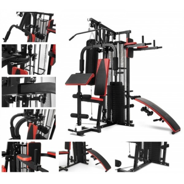 Модель использует стек с весовыми плитами общим весом 80 кг. Есть две тяги, парта Скотта, а также агрегат для ног.