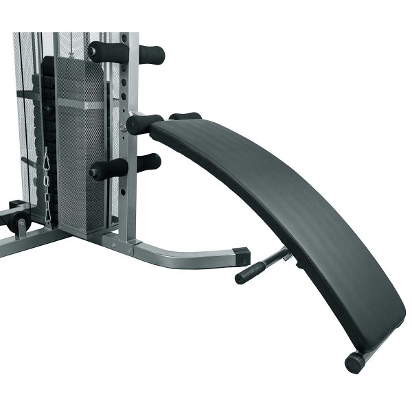 Модель оснащена стеком с весовыми плитами, которые позволяют регулировать нагрузку во время занятия. Есть две тяги, парта Скотта, агрегат для ног.