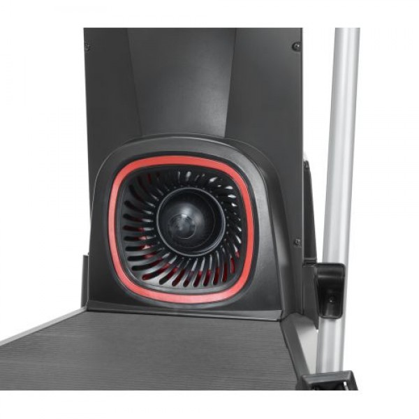 Контроль пульса выполняется через кардиопояс (приобретается отдельно). Есть держатель для бутылки и планшета, встроенные динамики.