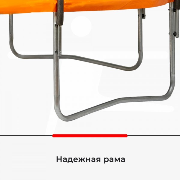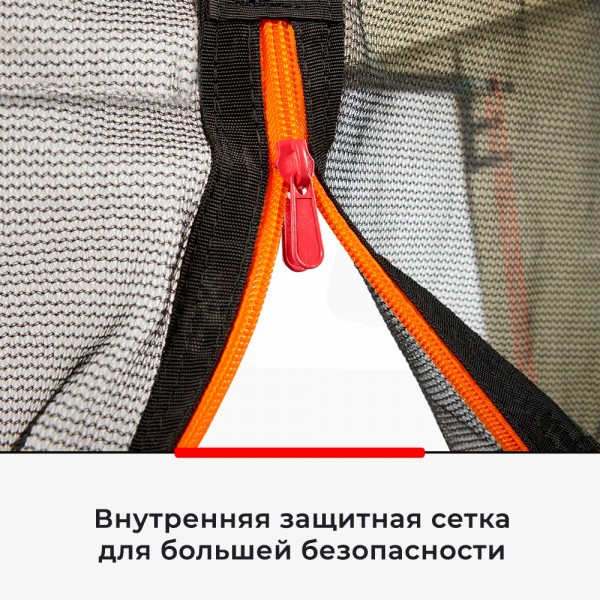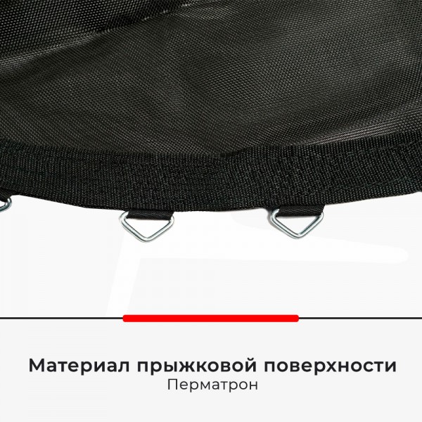 Прочная рама из стали с гальваническим покрытием, а для изготовления прыжкового полотна использован американский материал Перматрон. Пружинный блок закрыт специальным матом, а защитная сеть не позволит пользователю с ним контактировать. Вход внутрь сети закрывается на молнию.