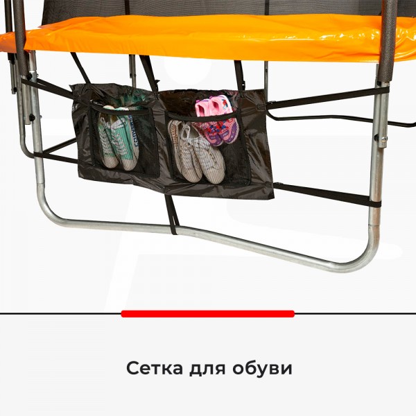 Батут комплектуется специальной сумкой, в которой можно хранить обувь. Её можно зафиксировать внизу на стойках.
