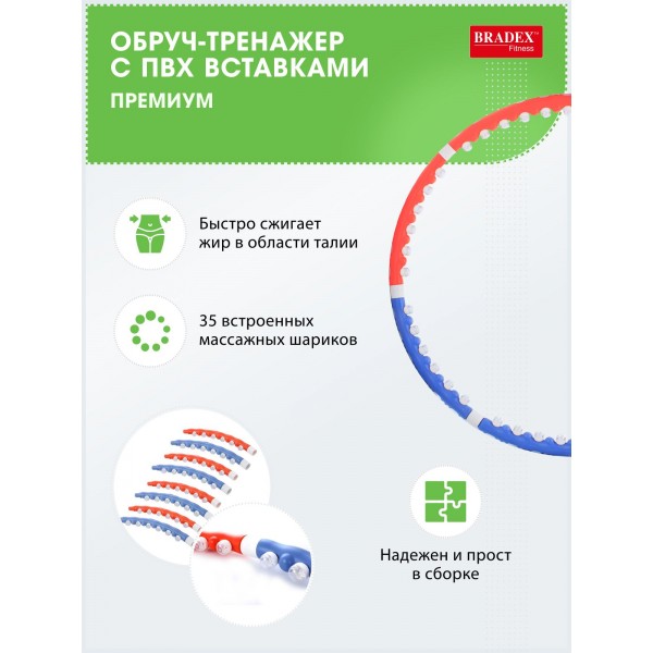 Обруч массажный Bradex Премиум SF 0001 состоит из семи частей, которые могут быть собраны всего за несколько минут. Такой обруч удобно перевозить.