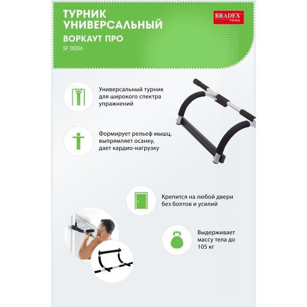 Bradex Воркаут ПРО SF 0006 - универсальный турник, который легко закрепить на любой двери без использования болтов. Также на нем можно выполнять упражнения на полу. Ограничение веса пользователя 105 кг.