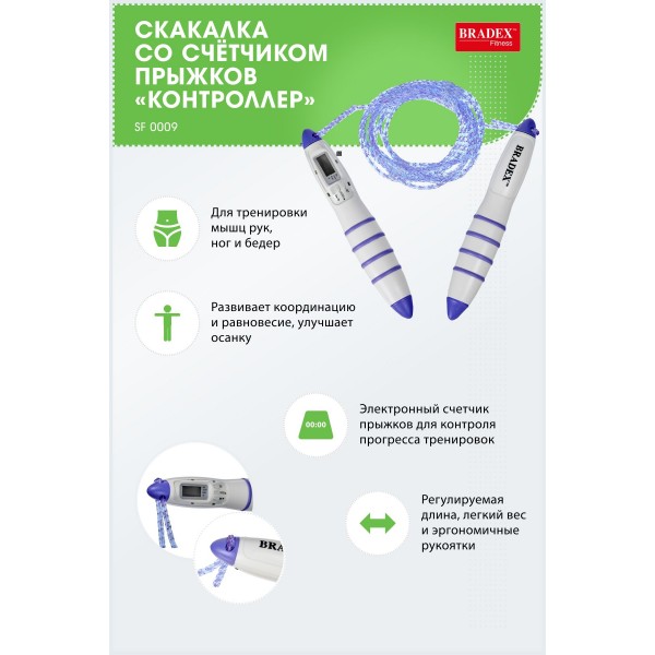 Скакалка Bradex КОНТРОЛЛЕР SF 0009 имеет встроенный в ручки электронный счётчик прыжков. Модель отличается легким весом, длину скакалки можно регулировать.