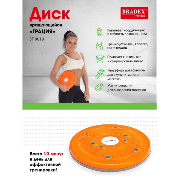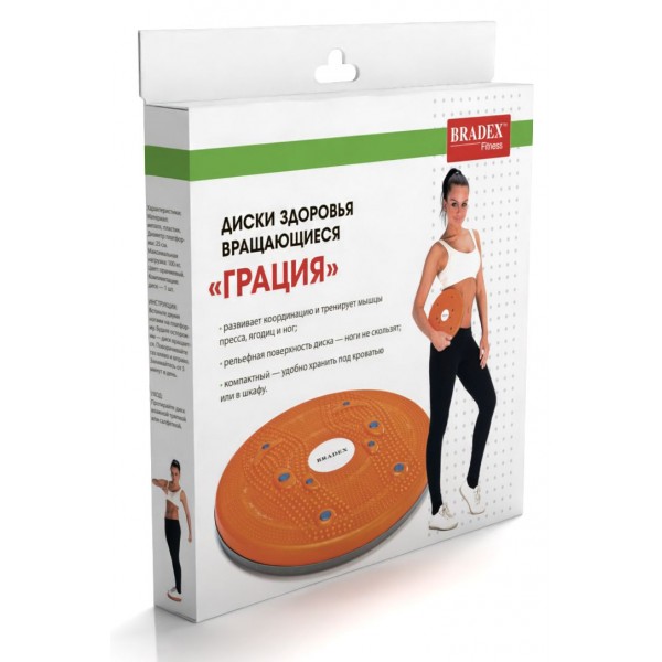 Bradex ГРАЦИЯ SF 0019 - вращающийся диск для бюджетных домашних тренировок, которые направлены на формирование пресса и талии. Рельефная поверхность диска дополнительно массажирует ступни, а дополнительная магнитотерапия, по заявлению производителя, помогает выводу токсинов.