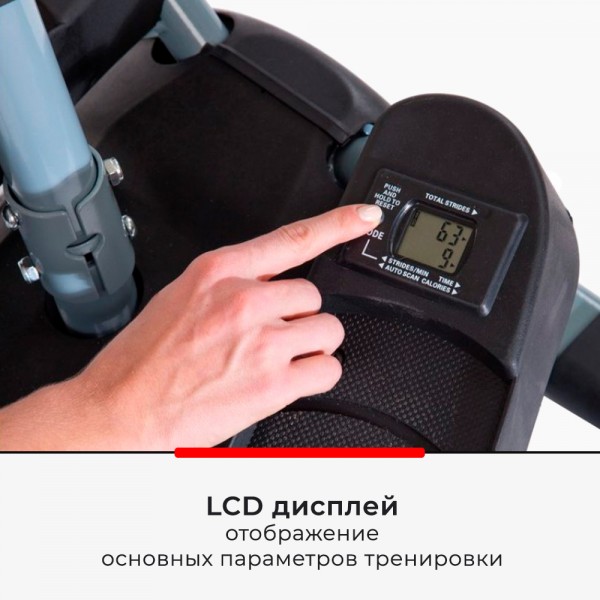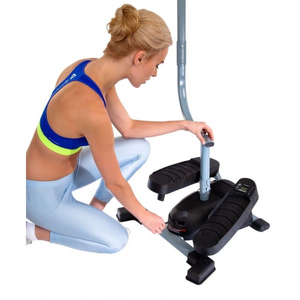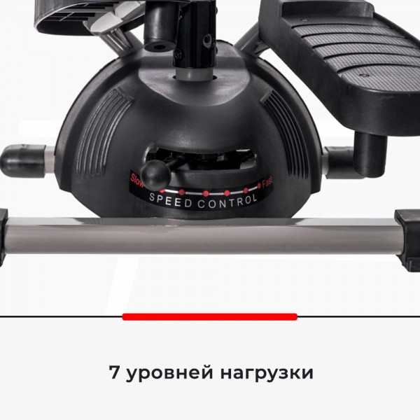 Модель имеет удобные поручни, которые позволяют выполнять вращение верхней частью туловища на 180 градусов во время движения ног на степпере. Можно выбрать 7 уровней нагрузки.