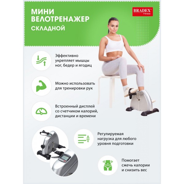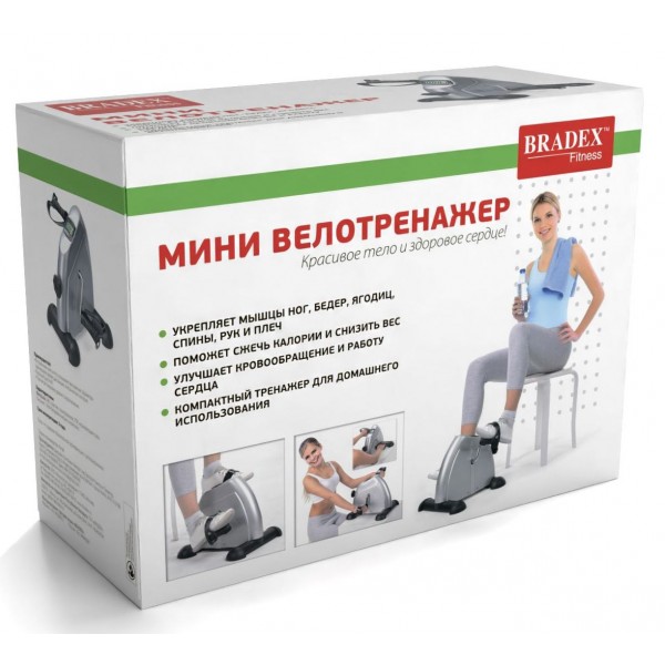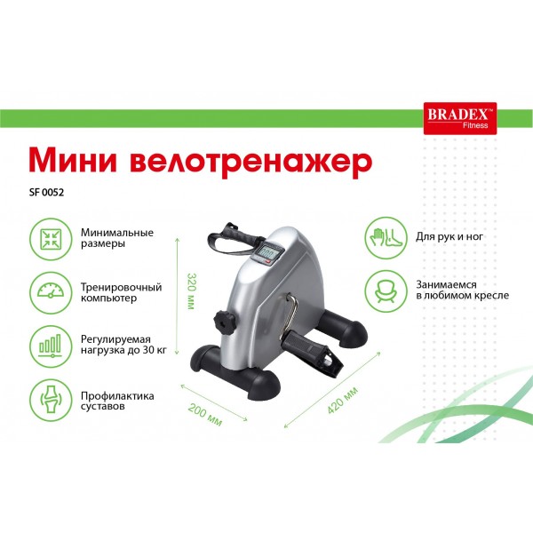 Bradex SF0052 разработан для комфортных домашних тренировок мышц ног и рук. Такой велотренажер занимает минимум места, заниматься на нем можно на кресле или диване.