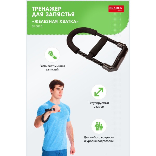 Тренажер Bradex ЖЕЛЕЗНАЯ ХВАТКА SF 0075 - модель оригинальной конструкции для работы над мышцами запястий , а также развитием предплечий. Снаряд изготовлен из прочного металла с удобными пластиковыми захватами с пенополиуретановым покрытием. Размер регулируется.