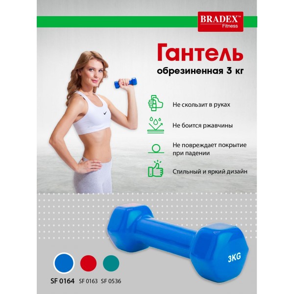 Гантель Bradex SF 0164 имеет резиновое покрытие, которое бережет руки от мозолей, а поверхность пола от следов ударов в случае падения. Вес 3 кг.