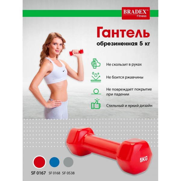 Гантель Bradex SF 0167 имеет резиновое покрытие, которое бережет руки от мозолей, а поверхность пола от следов ударов в случае падения. Вес 5 кг.