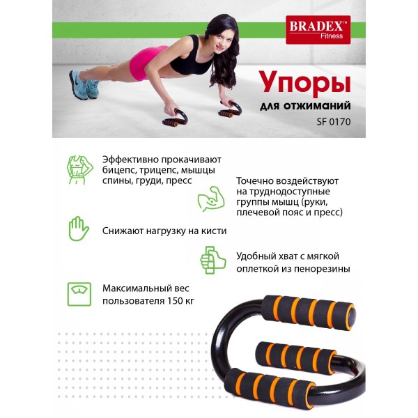 Bradex ТИТАН SF 0170 - комплект из двух упоров для отжимания оригинальной конструкции. Металлические упоры с удобными накладками для комфортного хвата исключают скольжение и подходят для занятий дома или на улице.