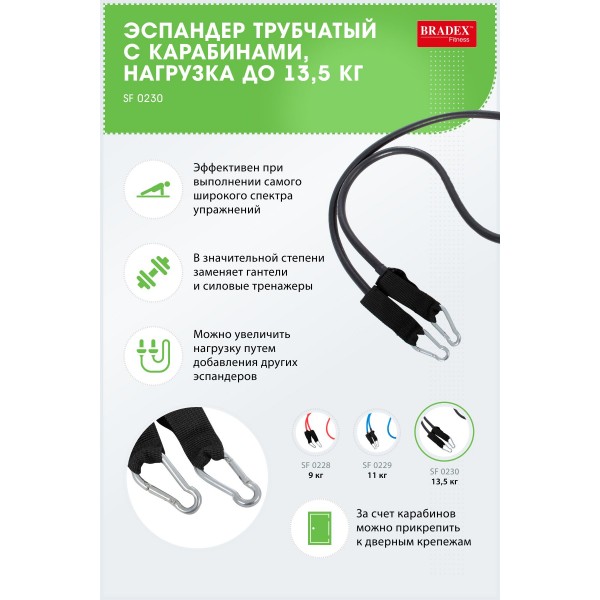 Эспандер Bradex SF 0230 оборудован надежными карабинами, которые крепятся на ручки или крепеж в дверной проем (приобретаются отдельно).