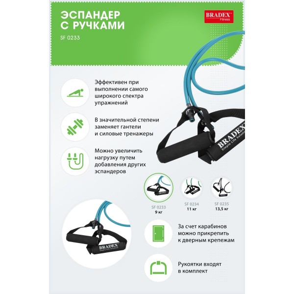 Эспандер Bradex SF 0233 поставляется в комплекте с ручками. Нагрузку можно увеличить, если добавить дополнительные эспандеры.
