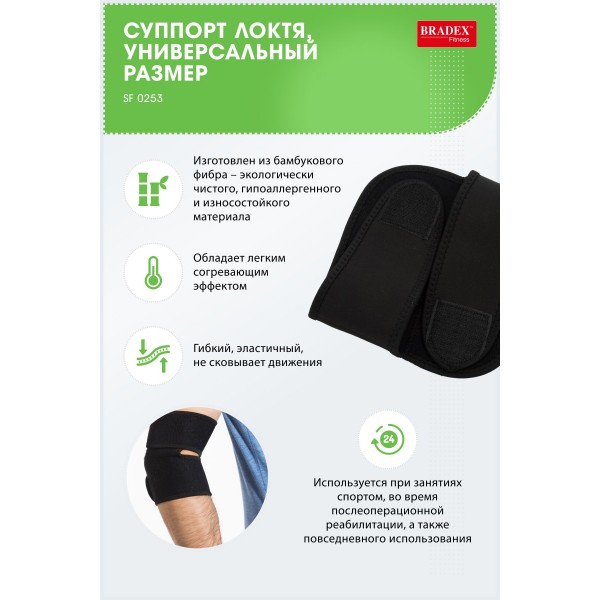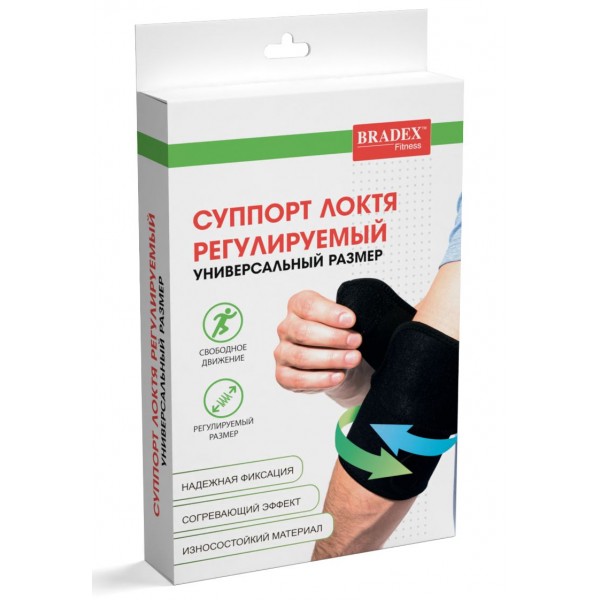 Суппорт Bradex для локтя SF 0253 из неопрена обладает разогревающим свойством и прочно фиксирует сустав. Подходит для реабилитации, повседневной носки и тренировок. Универсальный размер за счет застежки-липучки.
