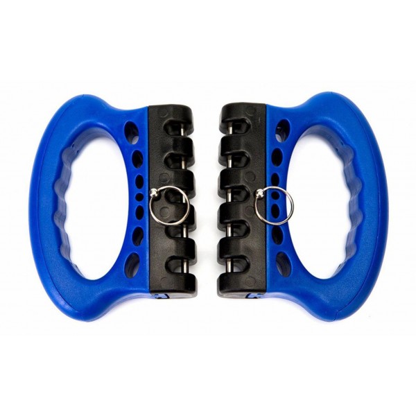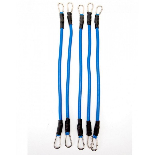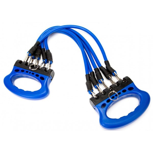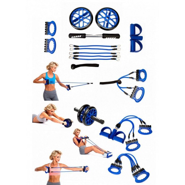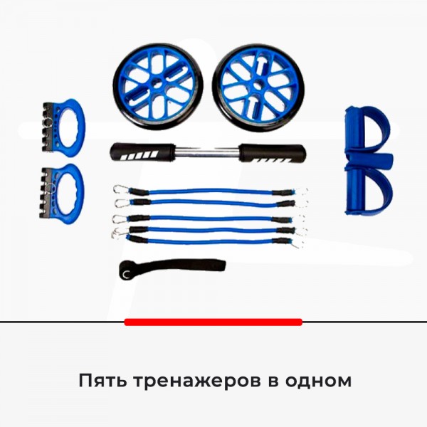 В комплект входят пять эспандеров (по 8,2 кг) с карабинами и ручками, колесо для пресса, упор для ног, а также крепление для эспандеров в дверной проем.