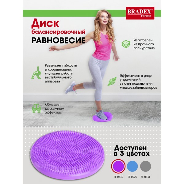 Bradex РАВНОВЕСИЕ SF 0332 - балансировочный диск для выполнения различных упражнений на нестабильной поверхности. Тренировка в таком режиме будет более эффективной, она улучшает координацию и равновесие, задействует дополнительные группы мышц.