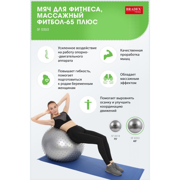 Мяч для фитнеса Bradex ФИТБОЛ-65 ПЛЮС SF 0353 - отличный вариант для реабилитации, коррекции осанки и ЛФК, подготовки к родам. Благодаря нанесенным по всей поверхности пупырышкам фитбол обеспечивает массажный эффект для всего тела.
